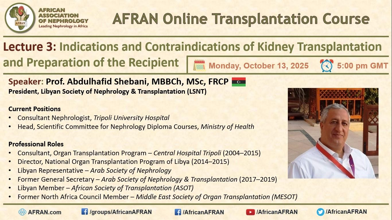 afran.com يمكنكم حضور المحاضرة عن طريق موقع Indications and Contraindications of Kidney Transplantation and Preparation of the Recipient يوم الاثنين علي تمام الساعة السابعة بتوقيت ليبيا سيقوم الدكتور عبدالحفيظ الشيباني بإلقاء محاضرة علي منصة زوم علي مستوى قارة افريقيا ، المحاضرة بعنوان