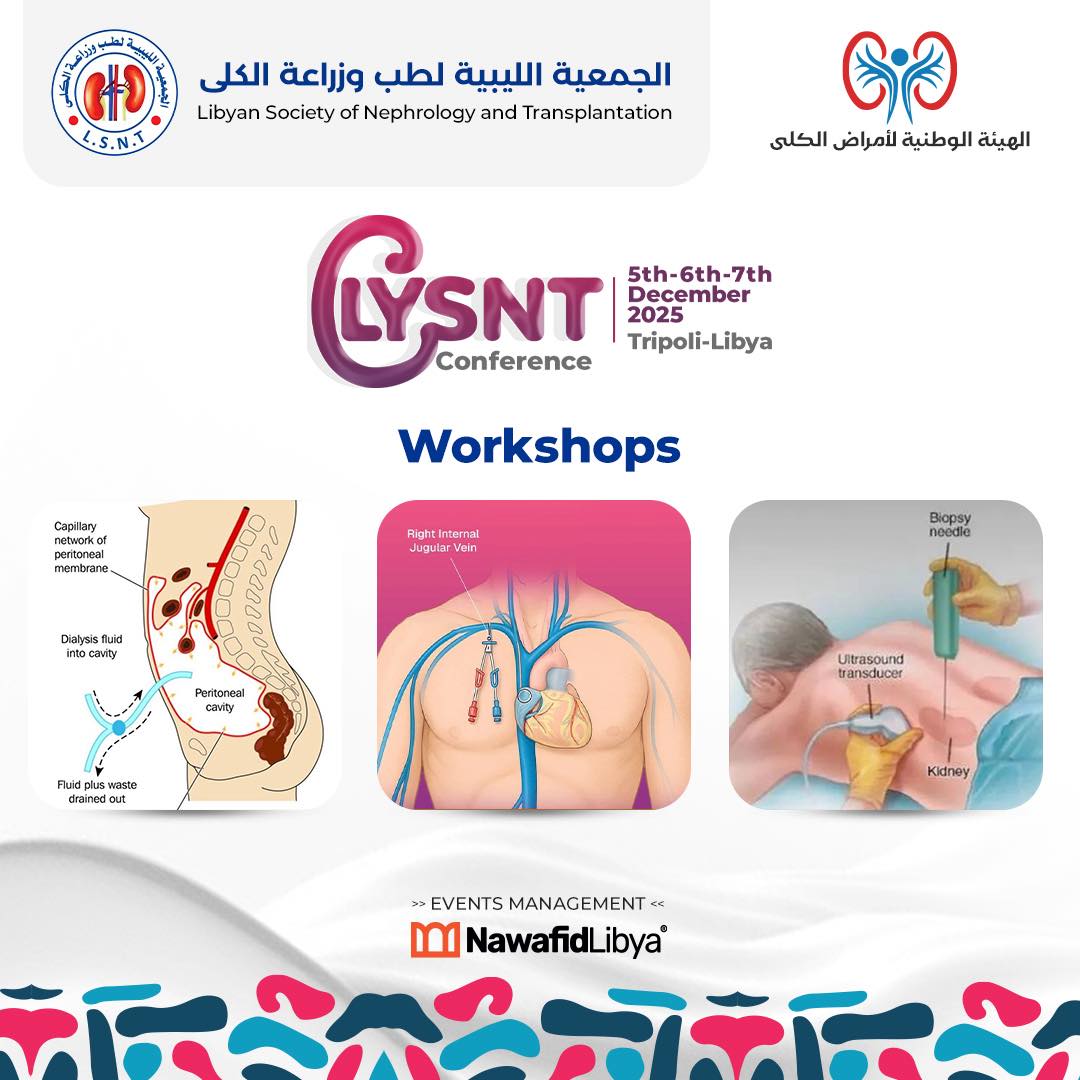 📅 5 – 7 ديسمبر 2025 📍 طرابلس – ليبيا يعلن المؤتمر السنوي العلمي للجمعية الليبية لطب وزراعة الكلى عن باقة من ورش العمل التدريبية المتخصصة التي ستُقام بالتزامن مع المؤتمر، بمشاركة نخبة من الأساتذة والاستشاريين المحليين والدوليين. 🔹 ورش العمل تشمل: • تقنيات أخذ عينات الكلى (Kidney Biopsy) • إدخال قساطر الغسيل الكلوي المؤقتة والدائمة • وضع قسطرة الغسيل البريتوني (Peritoneal Dialysis Catheter) • ورشة عمل عن الـ CRRT (العلاج التعويضي المستمر لوظائف الكلى) • ورشة عمل في الموجات فوق الصوتية (Ultrasound in Nephrology) 🩺 شهادات معتمدة من WKA / ISN ستمنح للمشاركين في كل ورشة. 📍 سيتم نشر روابط التسجيل الخاصة بكل ورشة قريبًا.